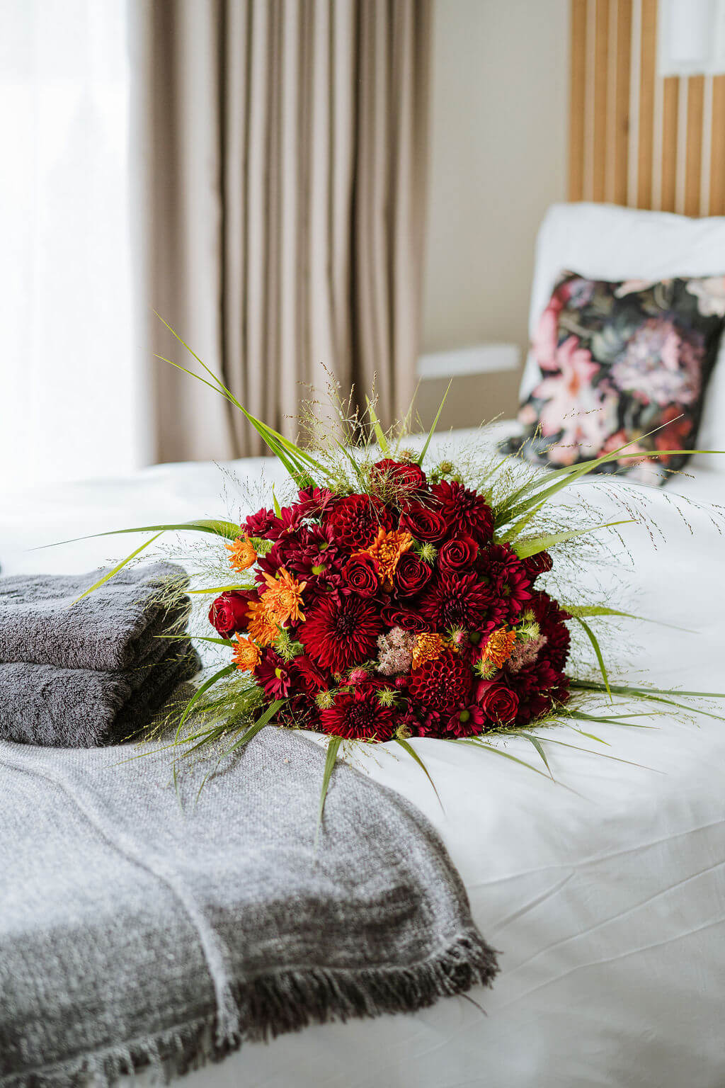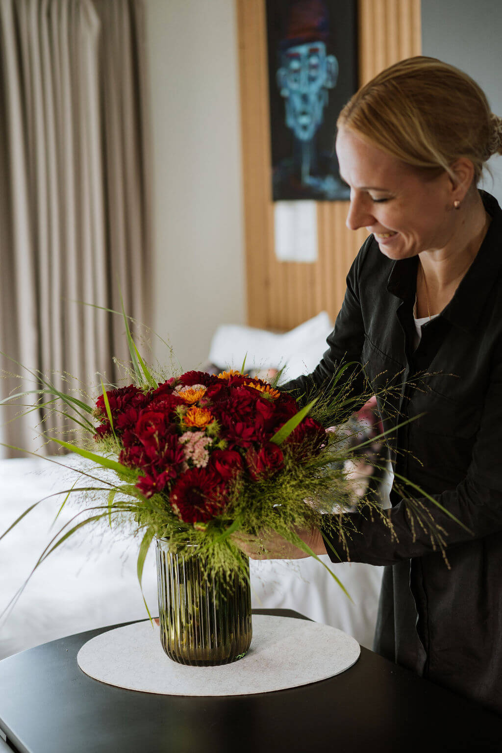 Ziedi var atšķirties no attēlā redzamajiem, jo tie ir sezonāli. Nepieciešamības gadījumā tie tiks aizvietoti, saglabājot pušķa stilu.