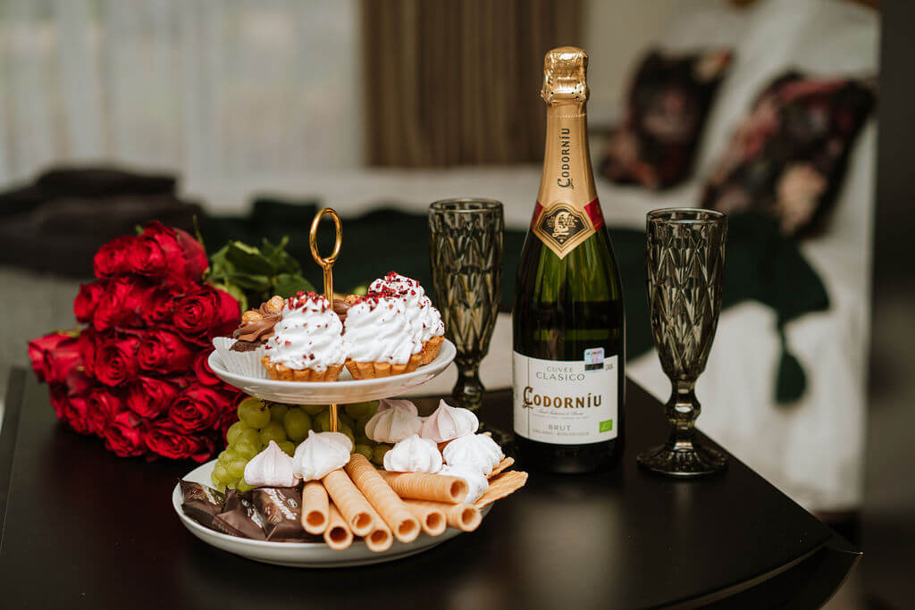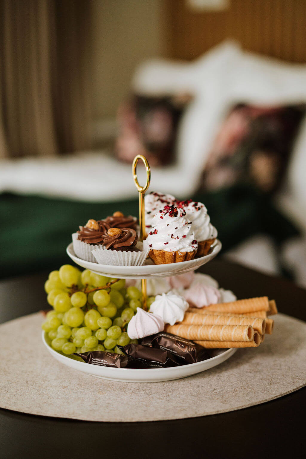 2 veidu kūciņas, 3 veidu cepumi (vafeles, bezē u.c.), vīnogas, konfektes.